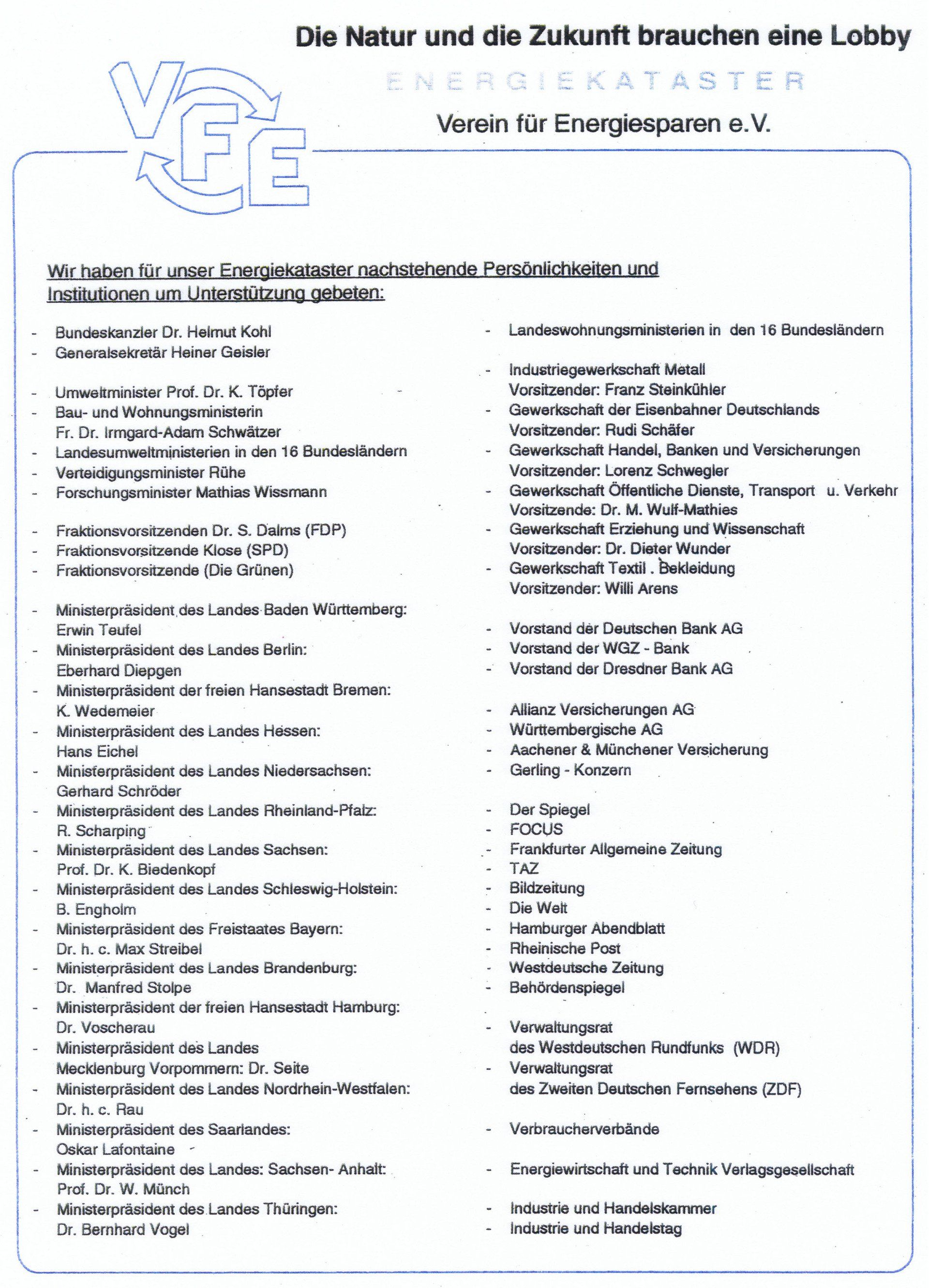 Mit der Gründung des Instituts für Energiesparen IfE und des Vereins für Energiesparen VfE 1990 bis 1993 wurden die Erkenntnisse und das Energiekataster der Öffentlichkeit vorgestellt. Die Verantwortlichen in der Wirtschaft, der Politik, den Gewerkschaften, Banken und der EVUs wurden gebeten diese Initiative zu unterstützen. Der Gipfel von Rio 1992 und die Verpflichtung der Anwesenden den Bereich zum Energiesparen zu unterstützen wurden als positives Element zur Gründung der IfE und VfE gesehen. Zur Umsetzung des Konzeptes sind Energiesparberater als Partner im Verein für Energiesparen gleichzeitig für den Einsatz von Energie-Sparprodukten und entsprechende Techniken verantwortlich.
